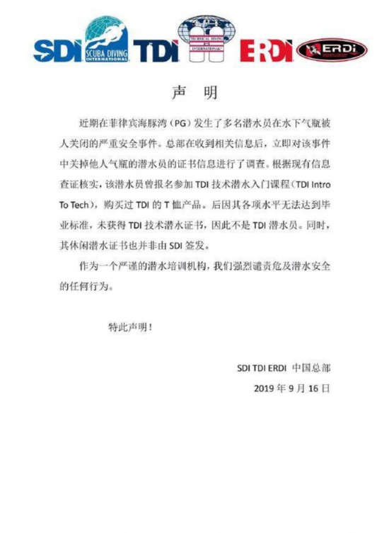 俞先生告诉记者,T仔的双瓶潜水教练已经知道这件事,并表示会写信给潜水组织说明情况,取消他的双瓶执照。同时,经SDI TDI ERDI中国总部(注:世界上最大的潜水教育机构之一)查证核实,T仔曾报名参加TDI技术潜水入门课程,但因水平没有达到毕业标准,未获得TDI技术潜水证书,其休闲潜水证书也非SDI签发。“作为一个严谨的潜水培训机构,我们强烈谴责危及潜水安全的任何行为。”