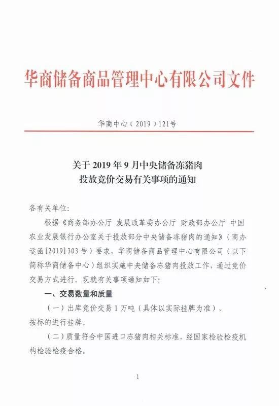 6天后,即9月17日,华商储备商品管理中心发布通知称,根据相关部委的要求,组织实施中央储备冻猪肉1万吨投放工作,将通过竞价交易的方式进行。通知显示,参与交易的每个企业,交易成交数量不超过300吨(含)。交易时间为9月19日下午13时-16时,竞价交易通过北京华商储备商品交易所系统进行。