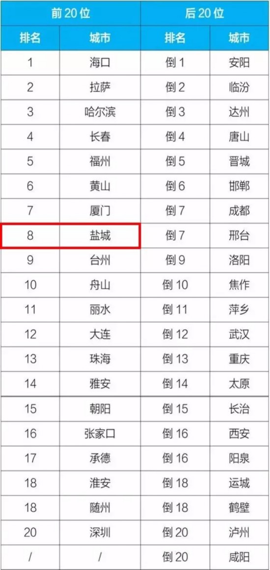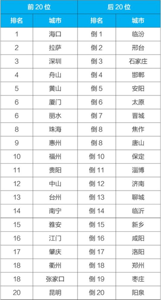 排名前20位和后20位城市名单