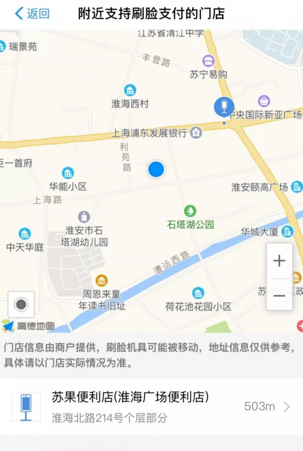 不过,目前,到店刷脸支付尚未大面积普及。进入手机支付宝“刷脸设置”,可以查看附近的刷脸门店。记者在淮海广场多个方位进行搜寻,系统均提示仅淮海北路一家品牌超市便利店支持到店刷脸支付。