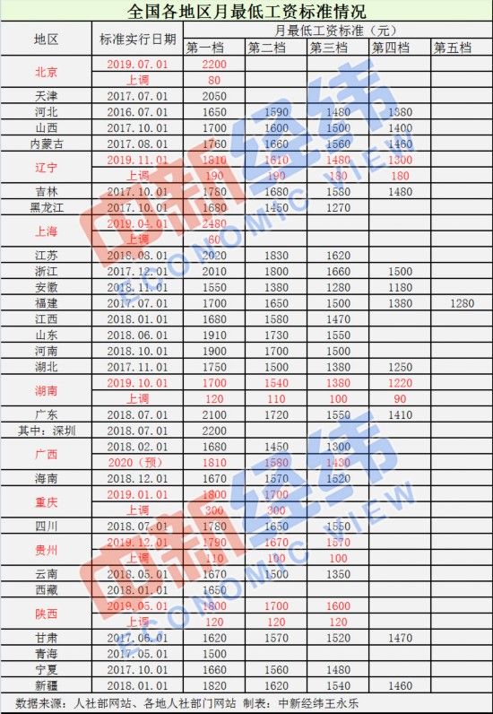 今年以来明确调整最低工资标准的地区至少有北京、辽宁、上海、湖南、重庆、贵州、陕西等7省份。