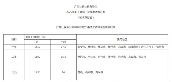 值得注意的是,去年上调最低工资标准的广西近日发布通告,征求2020年最低工资标准修改意见。根据征求意见稿数据计算,广西计划在2020将月最低工资标准上调130元。其中一类地区最低工资标准上调至1810元。