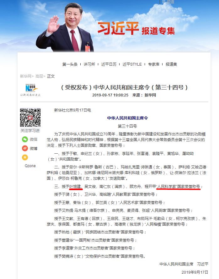 9月17日 国家主席习近平 签署主席令 授予泰兴籍科学家 叶培建 “人民科学家”国家荣誉称号