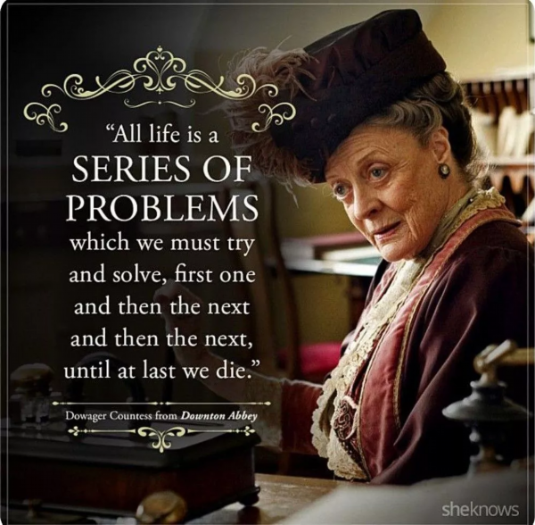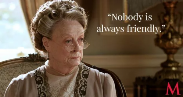 说完大小姐和大表哥,“定海神针”老夫人也必须有姓名。玛吉·史密斯,英国国宝级的影后。在《唐顿庄园》中扮演传统的英式贵族,刀子嘴豆腐心的太伯爵夫人。金句频出,承包了整剧的槽点。