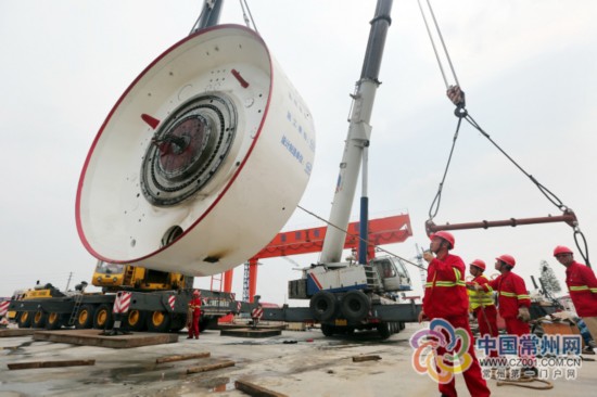 地铁1号线盾构机下井。