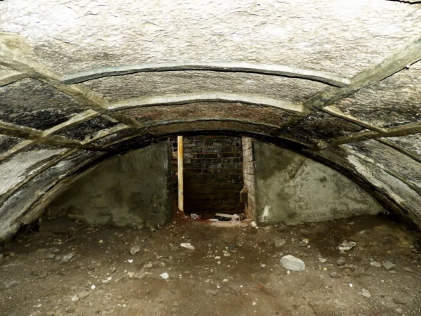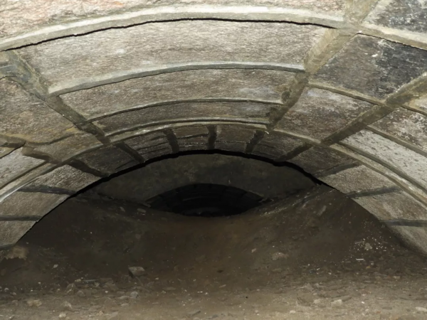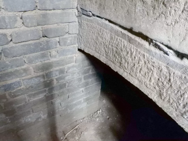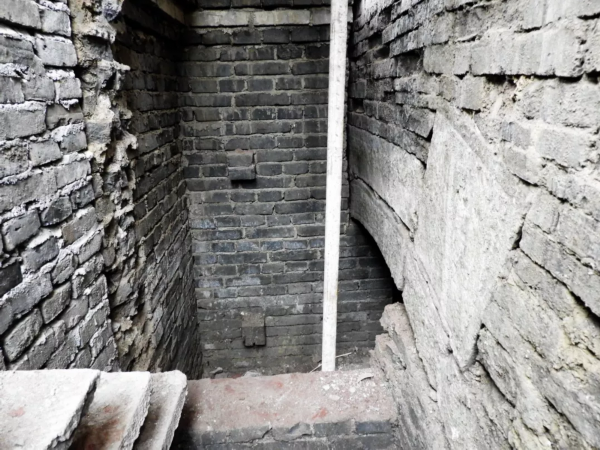 沿着台阶下到地下,大约2米多深。在下面可以看到,文昌阁阁下的水工部分很像一个半圆形涵洞:阁身用旧制青砖自汶河河床砌筑而起,外侧与阁下水工部分相平,并连为一体。下部南北向留设半圆形连续拱梁,为水流通道。仔细观察可以看到,入口处的拱梁下,用砖块砌墙进行了封堵,只留下一个可以容一人通过的进出口。连续拱梁形成的涵洞并未完全填实,半圆形的拱梁清晰可见,泥土上部与连续拱梁之间留有空隙,但空隙很小。