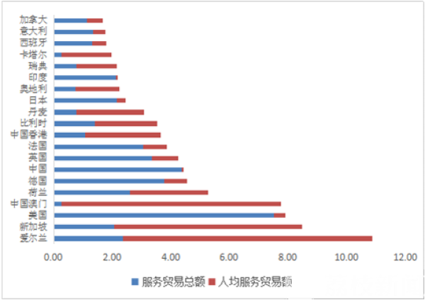 《报告》对全球81个经济体和国内30个省市以及17个典型城市、2个国家新区的服务贸易发展指数进行了分析。显示,中国服务贸易综合发展指数在全球排名第20位,是唯一一个进入前20的发展中国家。与去年相比上升1位。从分项指数来看,中国规模指数位列第7位,保持去年水平;服务贸易地位指数由去年的第6位上升至今年的第4位。