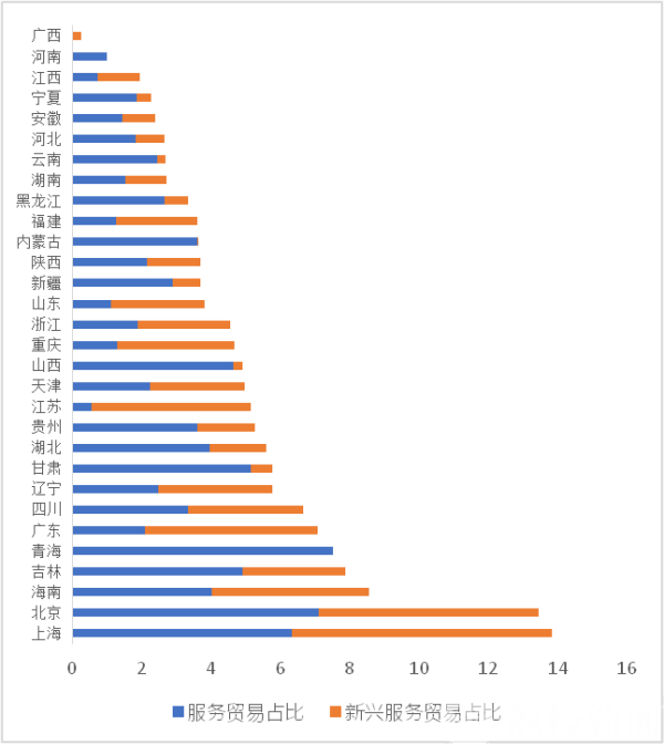 值得注意的是,江苏近年来服务贸易增长态势明显,其中新兴服务贸易占比突出。而且江苏的服务外包示范城市和服务贸易创新试点数量全国最多,服务贸易综合环境指数全国第一,因此综合发展实力较强。