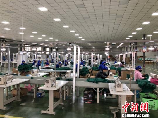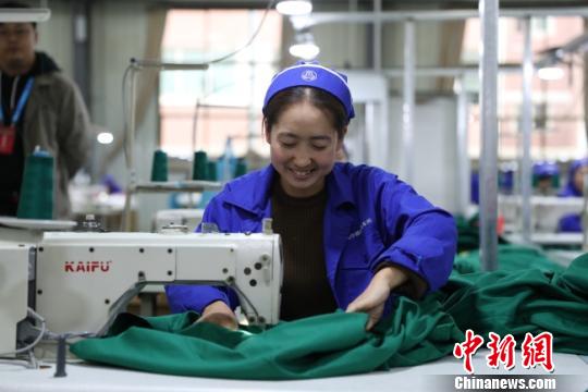 近日,中新网记者跟随“脱贫攻坚地方行—看甘肃线下走访活动”采访团走进了甘肃临夏州东乡县,见到了正在该县达板镇凤凰山联合扶贫车间内,为缝纫好的衣服剪线头的马祖力哈。