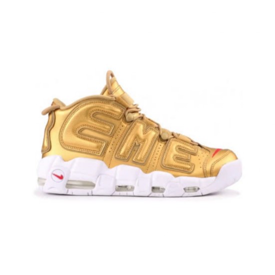 这三双与Supreme合作的Nike Air More Uptempo与其他的皮蓬战靴不同的是鞋身处并不是常有的大Air,而是Sup和Eme,让人一眼便能识别出这双鞋的身份。金色红色和纯黑都是十分适合搭配的。当时发售时半小时都没有被抢完,没想到现在已经起飞了。