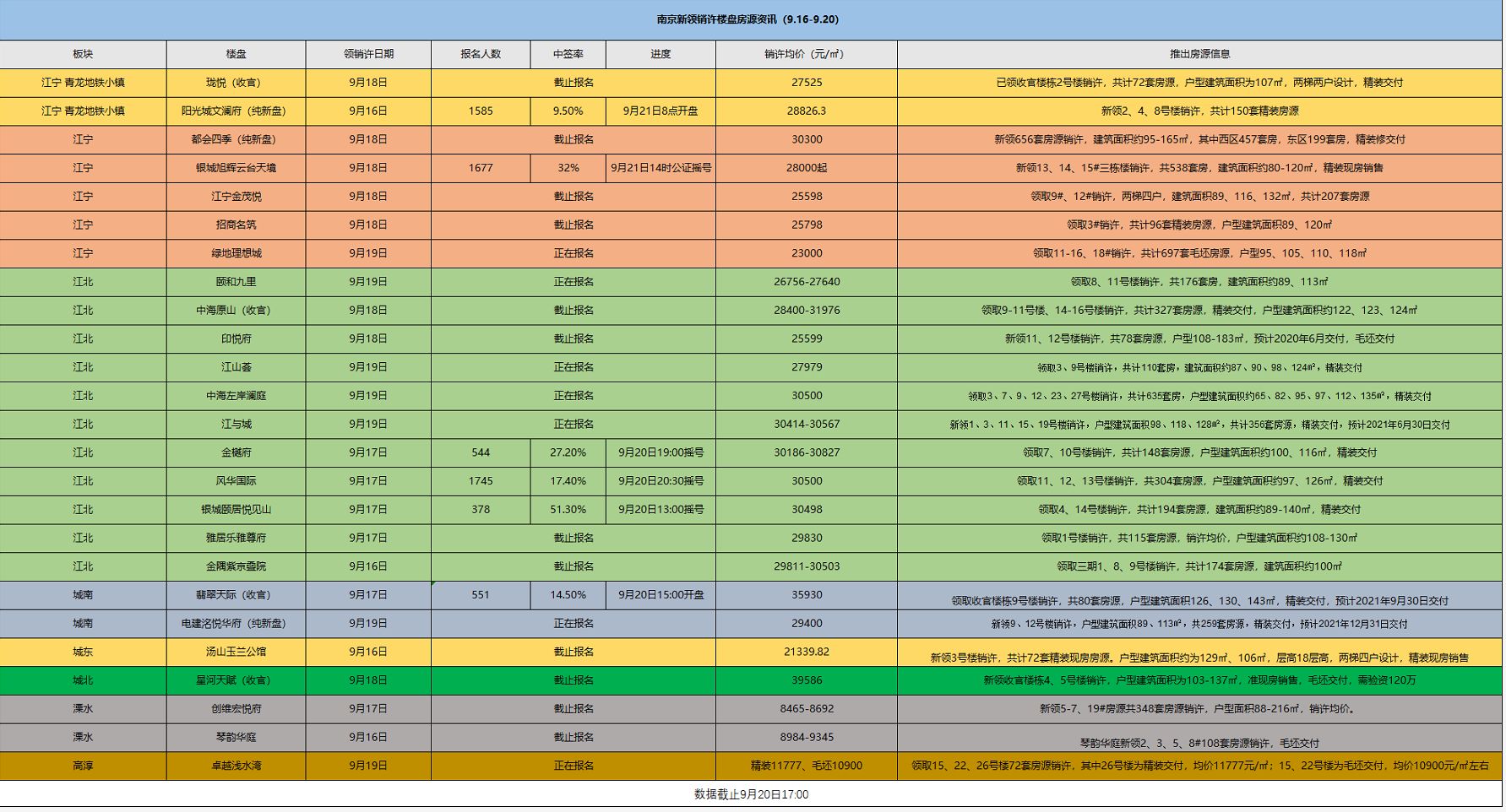 本周的南京楼市真是看点十足,截至目前,共26盘新领销许,超六千套房源。其中电建洺悦华府、都会四季、阳光城文澜府为纯新盘,珑悦、翡翠天际、星河国际本次加推房源为收官房源,看来“金九银十”房源的爆发威力还是十分充足的。再过不久就是国庆将至了,开发商再不领取销许就要多等一周啦!各开发商都不想错过双节的好时机,各显神通加入“抢人大战”。