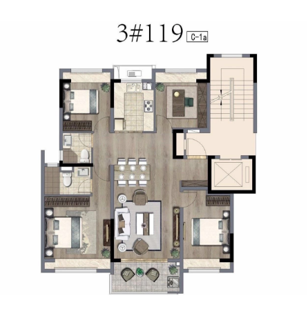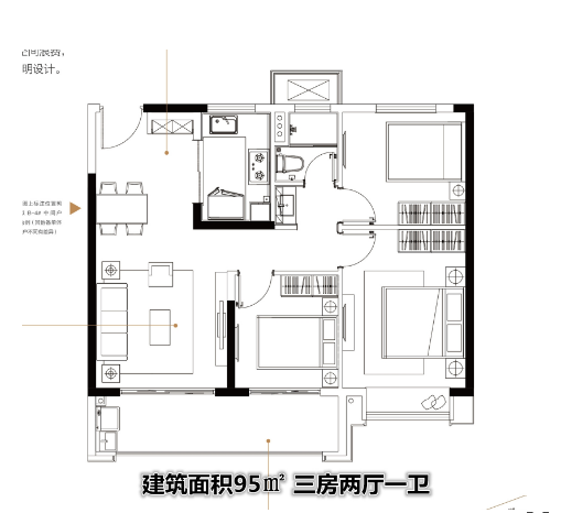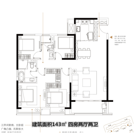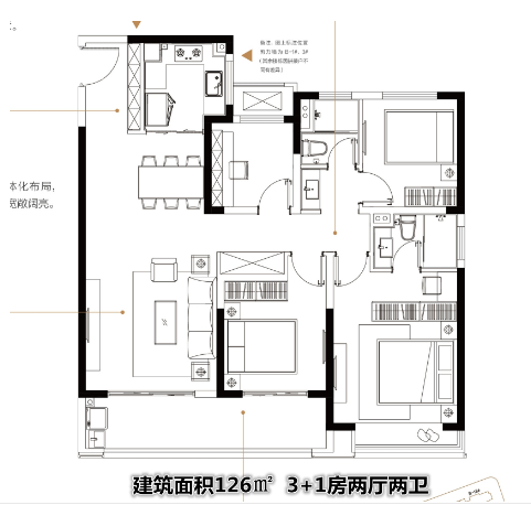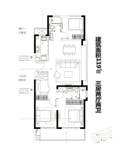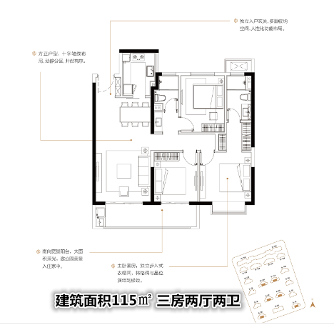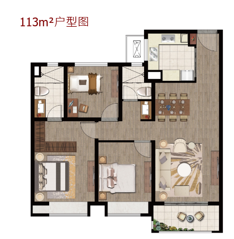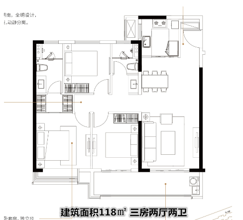 本次推出房源中的113㎡户型为3室2厅2卫设计,该户型三开间朝南,采光面充足,整室较为周正,南北通透;双卫设计,隐私性好,满足多口之家的需求。