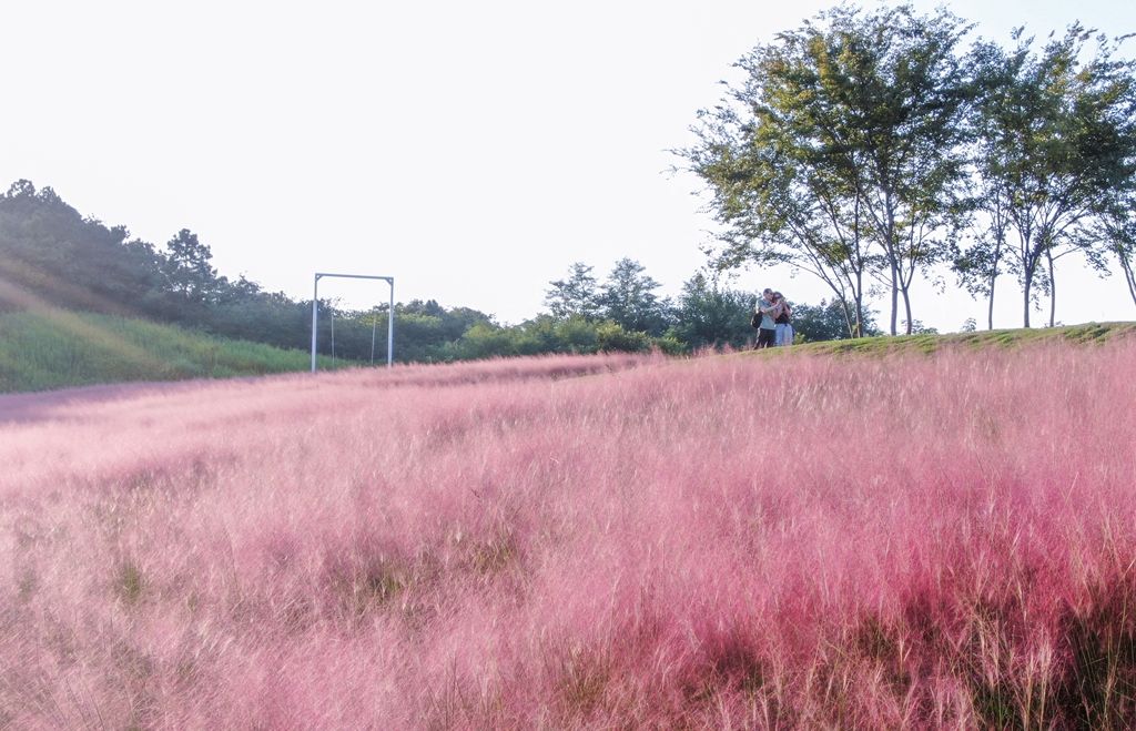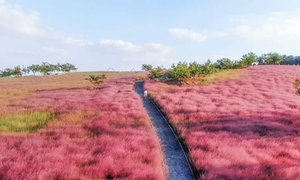 据悉,粉黛乱子草又名毛芒乱子草,是多年生暖季型草本景观植物,花期在9月到11月,花穗如云雾状。开花时,绿叶为底,粉紫色花穗如发丝从基部长出,远看如红色云雾,十分美丽。今年,句容市天王镇芝樱小镇首次种植了150亩粉黛乱子草。为了达到最佳观赏效果,技术人员从国外进口了第一代种子,目前已经花开大半,国庆期间将迎来最佳观赏期。