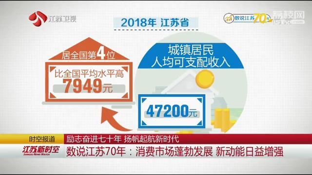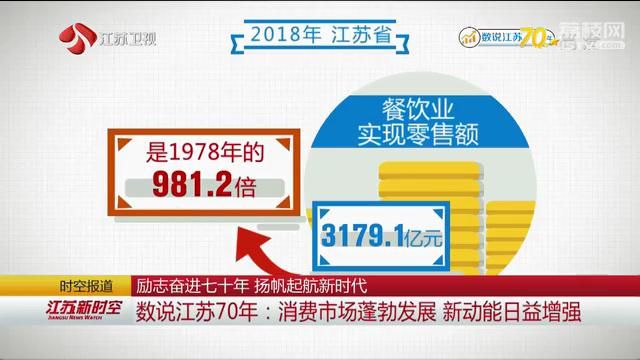 新中国成立70年来,特别是改革开放以来,江苏消费品市场规模不断扩大,市场结构发生深刻变化,消费逐渐成为经济增长的重要驱动力。1949年,江苏实现社会消费品零售总额8.5亿元,经过70年发展,我省流通网络日趋完善,商业网点遍布城乡,社会消费品零售额先后于1994年、2005年、2009年、2013年、2017年分别跨过1000亿元、5000亿元、10000亿元、20000亿元、30000亿元大关。2018年实现社会消费品零售总额33230.4亿元,保持年均12.7%的增幅。 而且随着居民收入持续增加,群众的消费水平也不断提高。