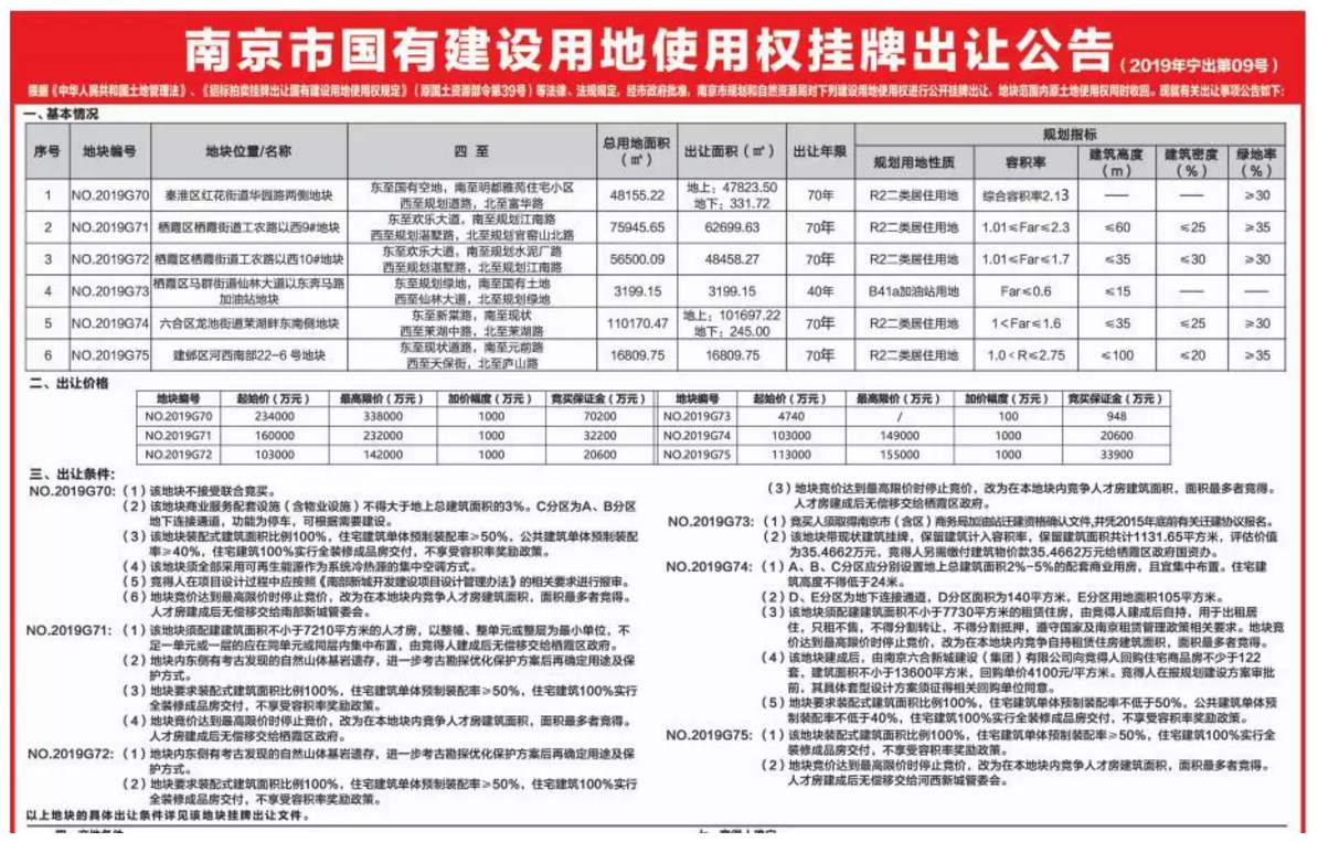 NO.2019G70(秦淮区红花街道华园路两侧地块),东至国有空地,南至明都雅苑住宅小区,西至规划道路,北至富华路。总用地面积48155.22㎡,出让面积地上47823.50㎡、地下331.72㎡,用地性质为二类居住用地,综合容积率2.13,起拍总价23.4亿,最高限价33.8亿,起拍楼面价22972元/㎡,最高楼面限价33181元/㎡,竞买保证金7.02亿元。