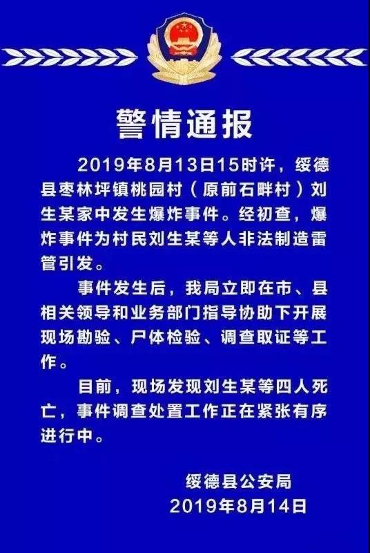 8月14日,绥德警方曾发布警情通报,称13日15时许,绥德县枣林坪镇桃园村(原前石畔村)刘生某家中发生爆炸事件。经初查,爆炸事件为村民刘生某等人非法制造雷管引发。该案后被称为“8·13爆炸案”。