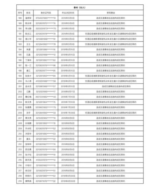 2019年5-8月份,江苏省共有250人因严重交通安全违法犯罪行为被依法吊销机动车驾驶证,且终生不得重新申领。今天,江苏省公安厅交警总队向社会曝光了这250人名单。