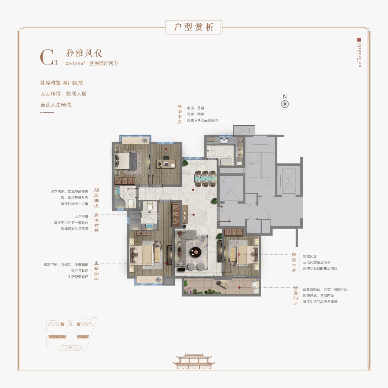 户型格局方正,南北纵向连贯,户户拥享270°环景视野、入户对景玄关、尊荣套房主卧、静谧书房等礼遇,而3.1米朗阔层高、私家电梯厅、至善生活精装人居细节等一系列豪阔设计,也让生活更具品位。C1户型北面的次卧还设置了飘窗,空间更通透,居住的舒适度也更高。