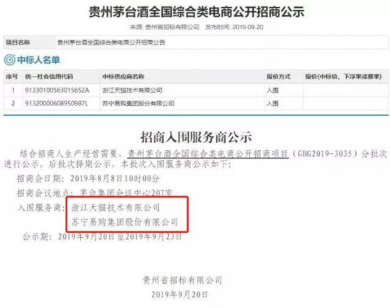 9月20日,茅台酒首批全国综合类电商招商结果出炉,浙江天猫技术有限公司和苏宁易购集团股份有限公司两家入围。