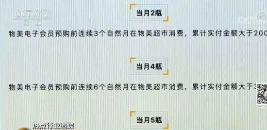 比如,物美电子会员需根据连续3个自然月真实消费额度,来确定茅台预约资格和数量,分为预购2瓶、4瓶、5瓶三档。