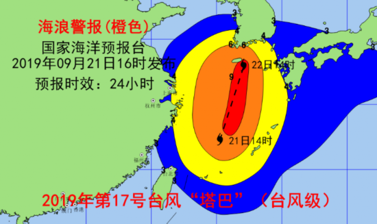 海浪II级警报(橙色):受今年第17号台风“塔巴”(台风级)和冷空气的共同影响,预计9月21日夜间到22日白天,东海将出现6~9米的狂浪到狂涛区,钓鱼岛附近海域、黄海南部将出现4到6米的巨浪到狂浪区,近海海浪预警级别为橙色;上海、浙江北部近岸海域将出现3到5米的大浪到巨浪,该近岸海域海浪预警级别为橙色;浙江南部、江苏近海南部将出现3~5.5米的大到巨浪,南通近岸海域将出现2.5~4米的大到巨浪,预警级别为黄色;盐城近岸海域将出现2~3米的中到大浪,预警级别为蓝色。