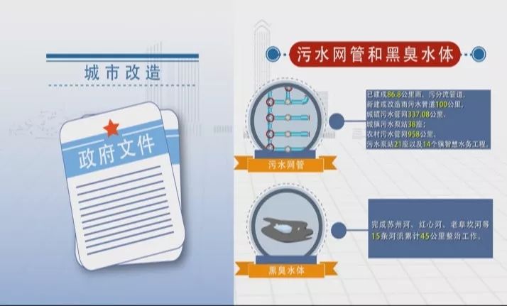 污水网管治理成效显著:已建成86.8公里雨、污分流管道,新建或改造雨污水管道100公里,城镇污水管网337.08公里、城镇污水泵站38座;农村污水管网958公里、污水泵站21座以及14个镇智慧水务工程。