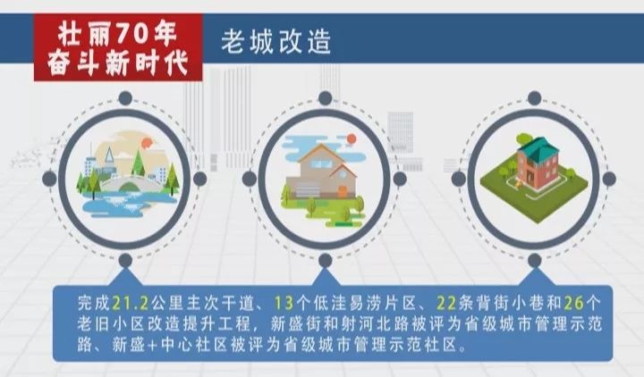 老城改造成效明显:完成21.2公里主次干道、13个低洼易涝片区、22条背街小巷和26个老旧小区改造提升工程,新盛街和射河北路被评为省级城市管理示范路、新盛+中心社区被评为省级城市管理示范社区。