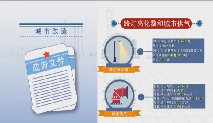 县城路灯亮化数量猛增:1985年底,县城路灯169杆盏,架空线路6.7公里。2019年,后街巷路灯已完成全覆盖工程,路灯数量达8548杆19639盏,增长了116倍。