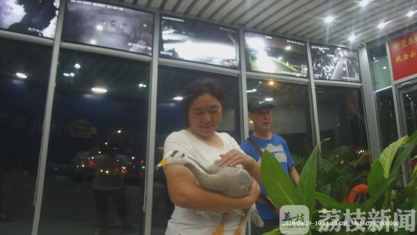 9月19号晚上7点左右,南京市民王女士抱着一只“大鸟”来到下马坊警务站,称在博爱湖附近散步时看到一只大雁往岸上走,这只大雁很特别,全身灰色的羽毛,头却是雪白的,上面还有两道黑色条纹,“我老公是大学老师,一看就知道是斑头雁,说是一级保护动物。”王女士说,因为知道大雁是群居动物,落单的肯定是身体弱的,担心山间有野猫会伤着它,就想带到玄武湖去放生。但想想,还是觉得交给警方处理比较靠谱。