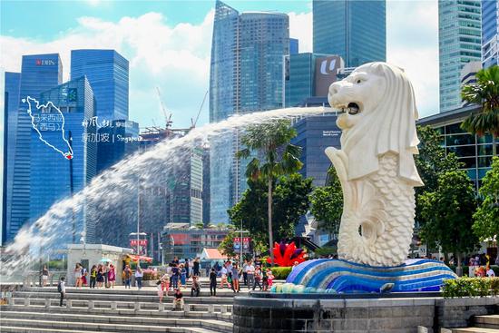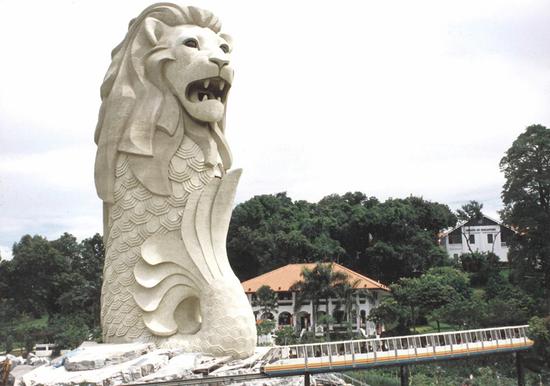 鱼尾狮是新加坡的标志。新加坡建有7座鱼尾狮雕塑,圣淘沙岛上这座建于1995年,高37米,内部中空,游客可购票乘电梯直达鱼尾狮顶端鸟瞰整个圣淘沙。