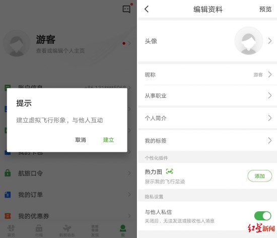 红星新闻记者进入航旅纵横APP进行试验,在“我”页面点击头像后,会弹出提示“建立虚拟飞行形象,与他人互动”。当点击“建立”后,会跳转至编辑资料页面,“与他人私信”一栏为默认开启状态。