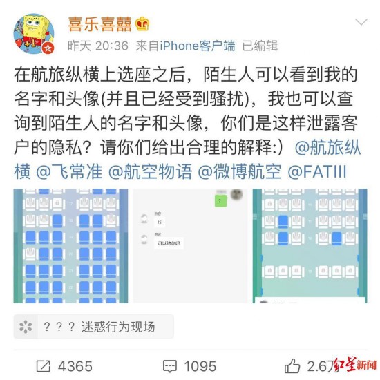 9月21日晚,网友@喜乐喜囍 在新浪微博发声称,她在航旅纵横APP上选座后,有陌生人向其发送“可以约你吗”等骚扰信息,而她发现,自己也可以通过航旅纵横查看航班上其他乘客的名字和头像。
