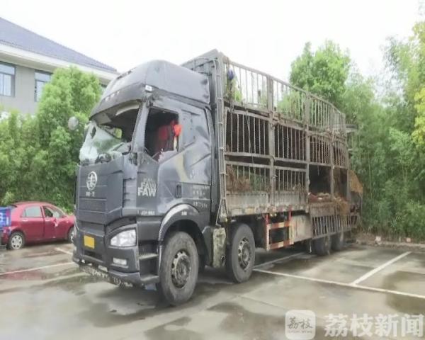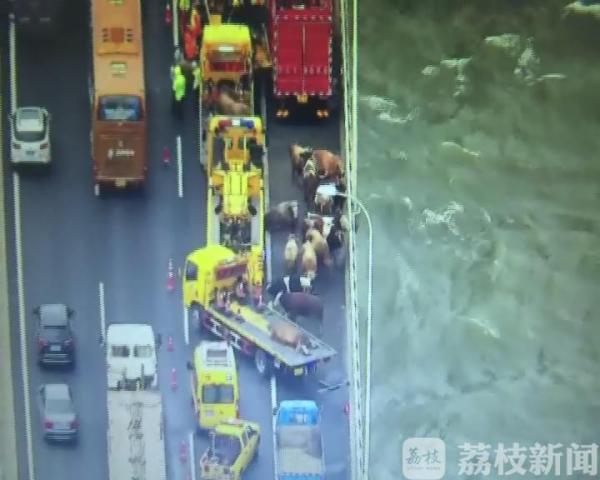 这辆大货车上大概装有二三十头活牛。凌晨两点多,货车由北向南行驶至苏通大桥桥面时,不知何因发生侧翻。驾驶员受轻伤,活牛从车上逃出,窜向桥面,部分活牛被车辆撞伤、撞死。