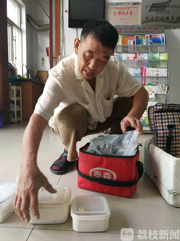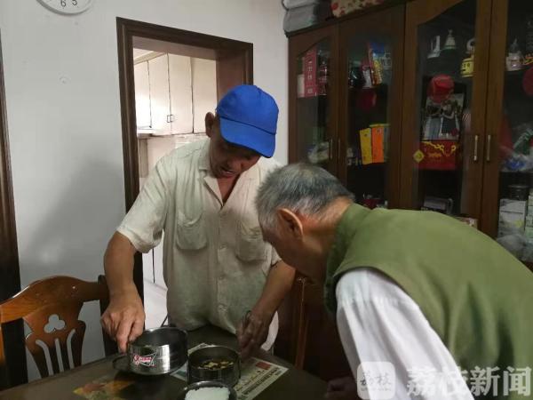9月20日上午十一点多钟,又到了吃午饭的时间,66岁的宣斌山准时来到姑苏区双塔街道翠园社区,领取了四份社区加工好的饭菜,由他送到定餐的几位老人家中。十多分钟后,宣斌山来到失独孤老姚师傅家。跟往常一样,宣斌山一边与姚师傅聊天,一边看着他把饭菜吃下。姚师傅说,他今年已经89岁高龄,长期一个人生活,腿脚走路很不方便,无法买菜做饭,每天的午餐和晚餐都是在社区预定后,由宣斌山免费按时送到他家。