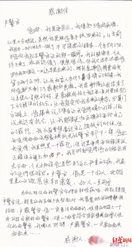 安某还手写了一份感谢信,信中提到他4年前因为一时冲动做了不可饶恕的错事,现在被卢霖亲手抓获,“很想恨您,但我又没有办法恨您,因为我知道这一天迟早会来的。特别感谢您特意给我留了两个小时,让我和家人交代了事情,我对您就只剩下了感谢和感激。”