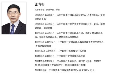 对于张青松离开进出口银行,进出口银行人士也略显惊讶。张青松于2018年9月起任进出口银行行长,至今仅一年时间。但进出口银行人士评价其“很务实,又勤勉”。在赴任进出口银行前,张青松一直在中国银行工作,曾任中国银行党委委员、副行长。