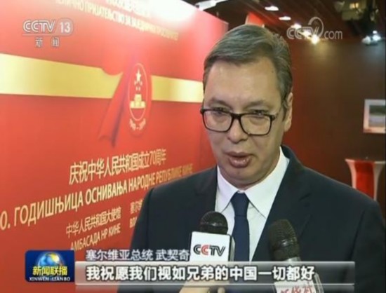 21日,中国驻塞尔维亚使馆举办主题为“钢铁友谊 共创繁荣”的国庆70周年招待会。塞尔维亚总统武契奇参加了招待会,并发表致辞高度评价中国的发展成就,感谢中方“一带一路”倡议等给塞尔维亚带来的发展机遇。他对中华人民共和国成立70周年表示衷心祝贺。