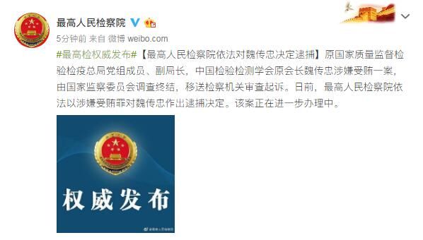 原国家质量监督检验检疫总局党组成员、副局长,中国检验检测学会原会长魏传忠涉嫌受贿一案,由国家监察委员会调查终结,移送检察机关审查起诉。日前,最高人民检察院依法以涉嫌受贿罪对魏传忠作出逮捕决定。该案正在进一步办理中。