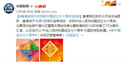 香港特区政府今天发布消息称,香港将于10月1日举行连串活动,庆祝中华人民共和国成立七十周年。主要活动包括升旗仪式暨国庆酒会和推出重新编排的“幻彩咏香江”灯光音乐汇演,以及发行以“中华人民共和国成立七十周年”为题的特别邮票。