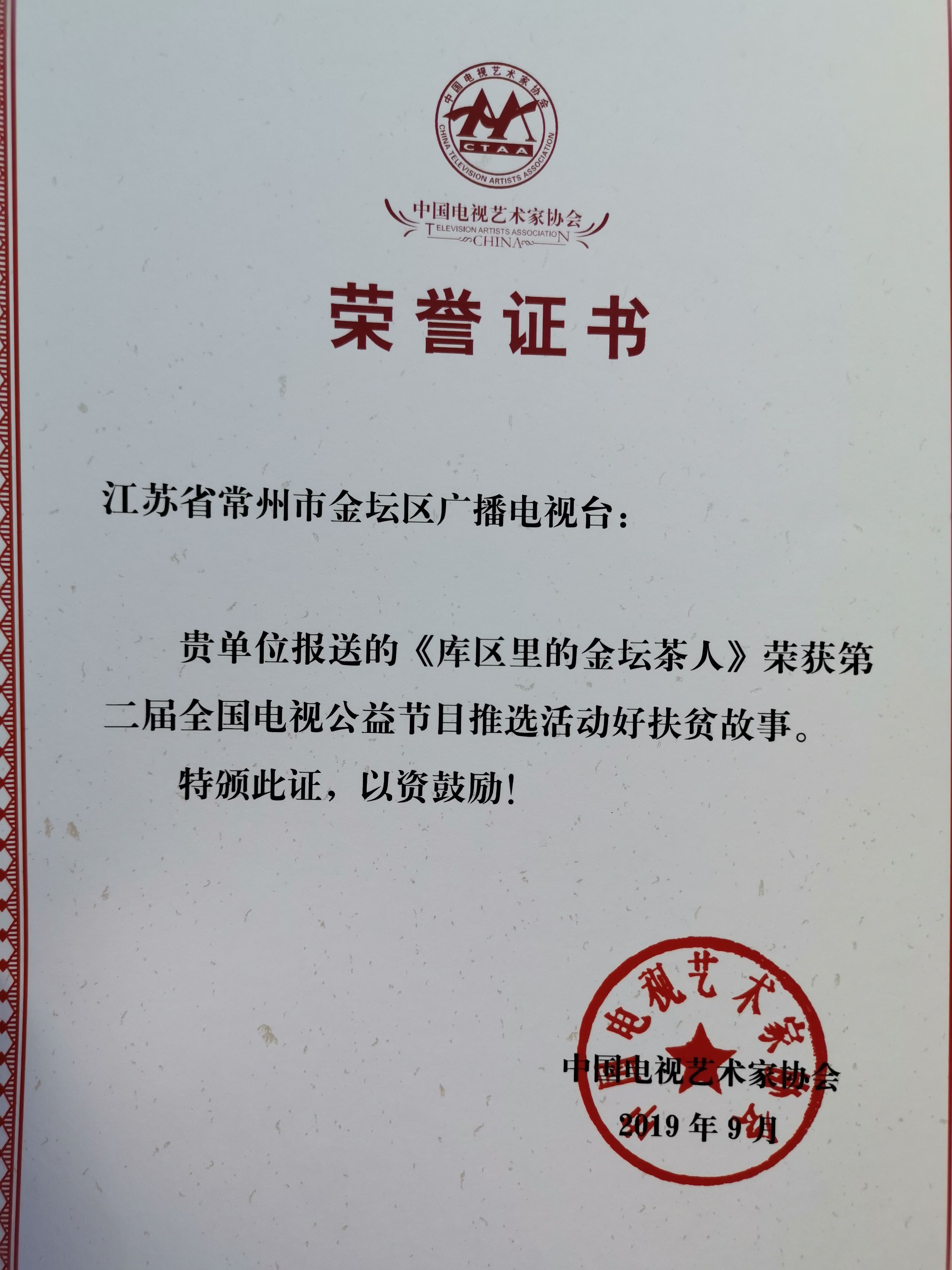 9月20日,2019年中国全媒体公益影像盛典在深圳举行,金坛广播电视台创作的公益专题片《库区里的金坛茶人》从600多件征集作品中脱颖而出,荣获第二届全国电视公益节目推选活动好扶贫故事。