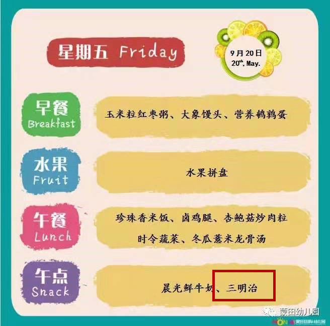 有家长怀疑此次疑似食物中毒事件是“吃了学校的午点三明治引起”。荔枝新闻从蒙田幼儿园微信公众号了解到,9月20日的午餐,该幼儿园的确有为孩子提供三明治。