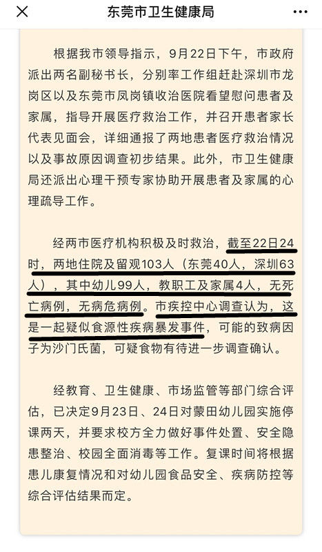 9月21日,广东东莞市凤岗镇疾控中心接到该镇蒙田幼儿园报告称,陆续有家长反映孩子出现不适,疑似食物中毒。23日上午,东莞市卫生健康局针对该事件发布发布通告称市疾控中心调查认为,这是一起疑似食源性疾病暴发事件,可能的致病因子为沙门氏菌,可疑食物有待进一步调查确认。