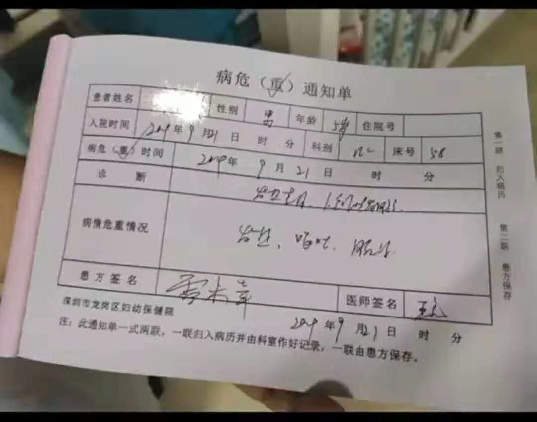 家长提供的疑似该幼儿园幼儿的病重通知单