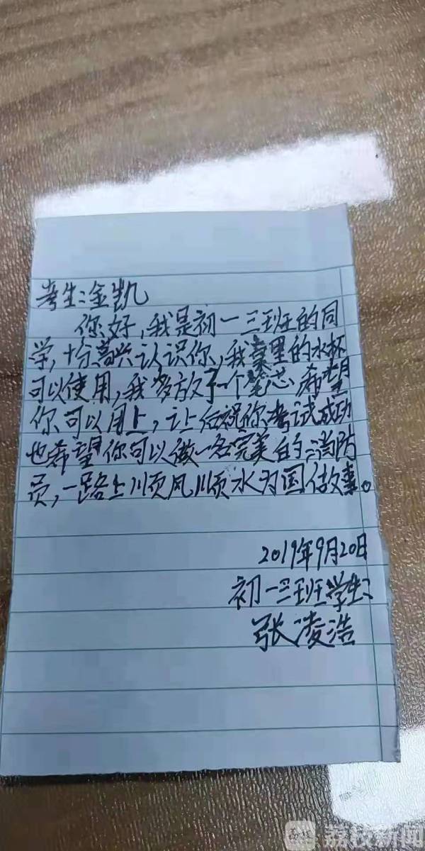 金凯得知记者找到了留字条的张凌浩,在电话里向他表示了感谢,他也告诉小凌浩,自己考试发挥得不错。