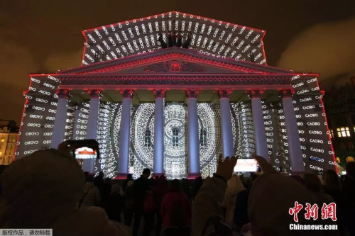 资料图:当地时间2019年9月21日,俄罗斯莫斯科举办第九届“光之环”国际灯光节。人们在莫斯科大剧院前欣赏灯光秀表演。