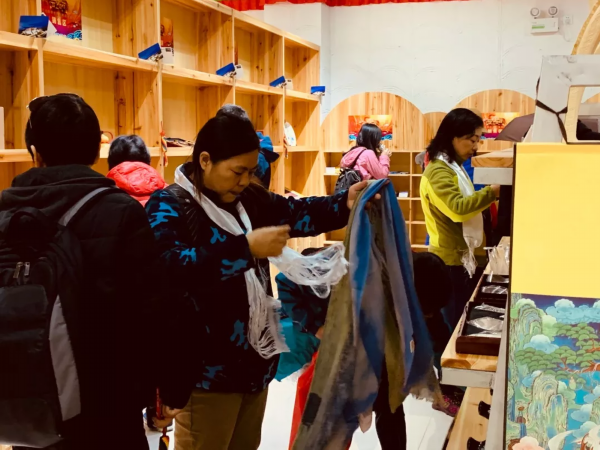 游客在达孜叶巴村游客服务中心选购文创产品。