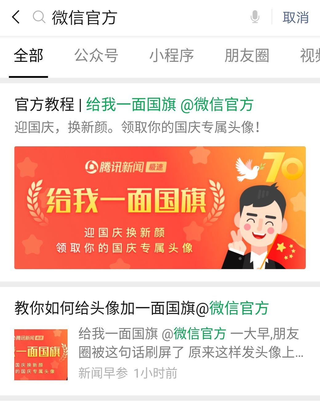 首先在微信搜索框输入“微信官方”,第一条便是“官方教程|给我一面国旗@微信官方”。