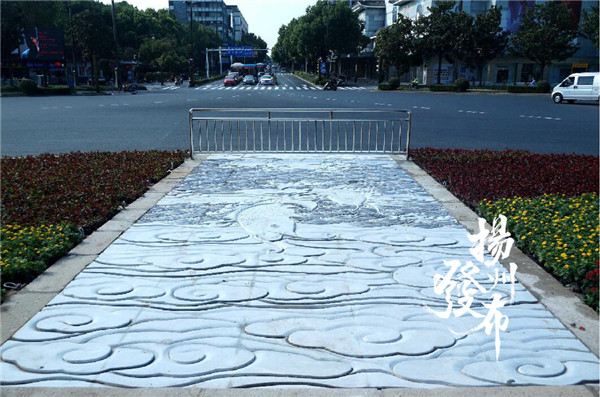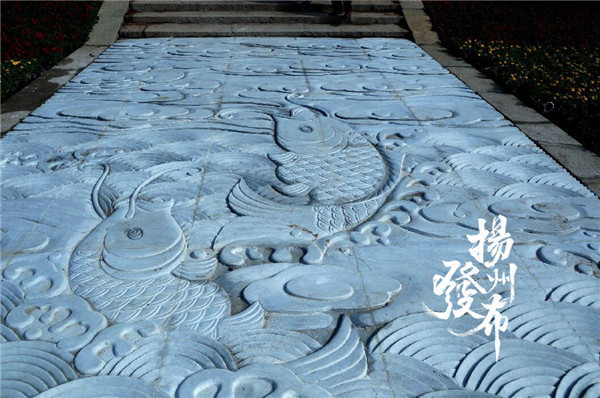 专家介绍说,文昌阁属明代扬州府学建筑。当年此处有一条南北向的汶河,河上建有石桥,文昌阁原先建在桥上,后来损毁重修。到解放前,汶河淤塞严重成为臭水沟,阻碍了城市交通发展。1952年,扬州市政府填平汶河,后沿河道新建汶河路,建筑基础也被埋入地下。此次文昌阁大修中,在文昌阁的南、北拱门处,增设了白矾石步道;从空中看,就像一条白色的河流,从而让“汶河穿城过,桥上砌楼阁”的历史再现,同时展现了文昌阁和古汶河的文化渊源。而白矾石步道上雕刻的鲤鱼、波浪、云朵等图案,主要有两个寓意,一是象征着“平步青云”,二是象征学子“鲤鱼跳龙门”。