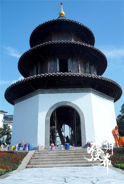 施工负责人介绍,文昌阁为砖木结构,三层重檐,攒尖顶,筒瓦屋面,通高24.25米。阁身呈八角形,底层以青砖砌筑,四面辟拱门,东西门嵌“文昌阁”额。门外各有10级台阶。此次大修采用揭瓦不落架大修方式进行。“揭瓦不落架大修”就是在不动房屋结构的前提下,将屋顶、屋檐掀开,视房屋损坏情况进行零件维修及更换,解决屋面渗漏渗水问题,对木构架、木装修、地面等做全面维修。为了达到“修旧如旧”的目的,施工在具体操作中采用传统的建筑材料、传统工艺和技术,力求保持文昌阁的古色古香。目前,文昌阁“揭顶不落架大修”基本完成,破损砖瓦、腐烂木结构都更换一新。