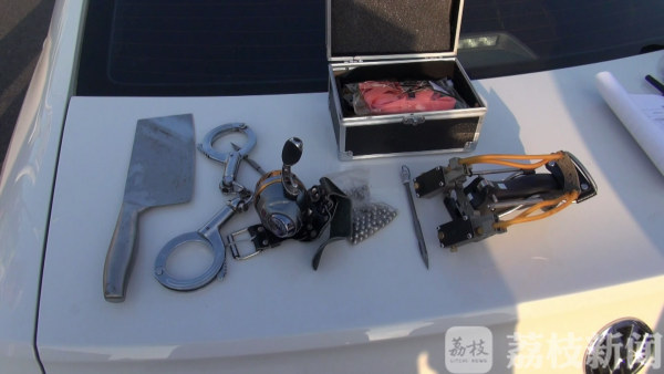 9月23日下午4点多钟,盐城市大丰区公安局为保证国庆安保,在沈海高速大丰收费站设点对过往的车辆进行检查,就在这时有一辆连云港号牌的红色轿车见有民警在前方检查,显得特别慌张,民警发现这一情况立即仔细对该车进行检查,在后备箱中民警查到一副警用手铐、菜刀一把,而在前面驾驶室民警又发现有只不寻常的盒子,打开一看是一把大功率带红外线的弹弓以及飞镖两支,钢球两千多颗,民警立即对该驾驶员控制并核实驾驶员的身份信息,经民警通过警务平台查询为涟水人姓李,据李某交代,他车上的大功率弹弓是从网上花三百元购买,李某称是用来捕鱼的,而车上的警用手铐是他从一位朋友手上花三百元买来的。